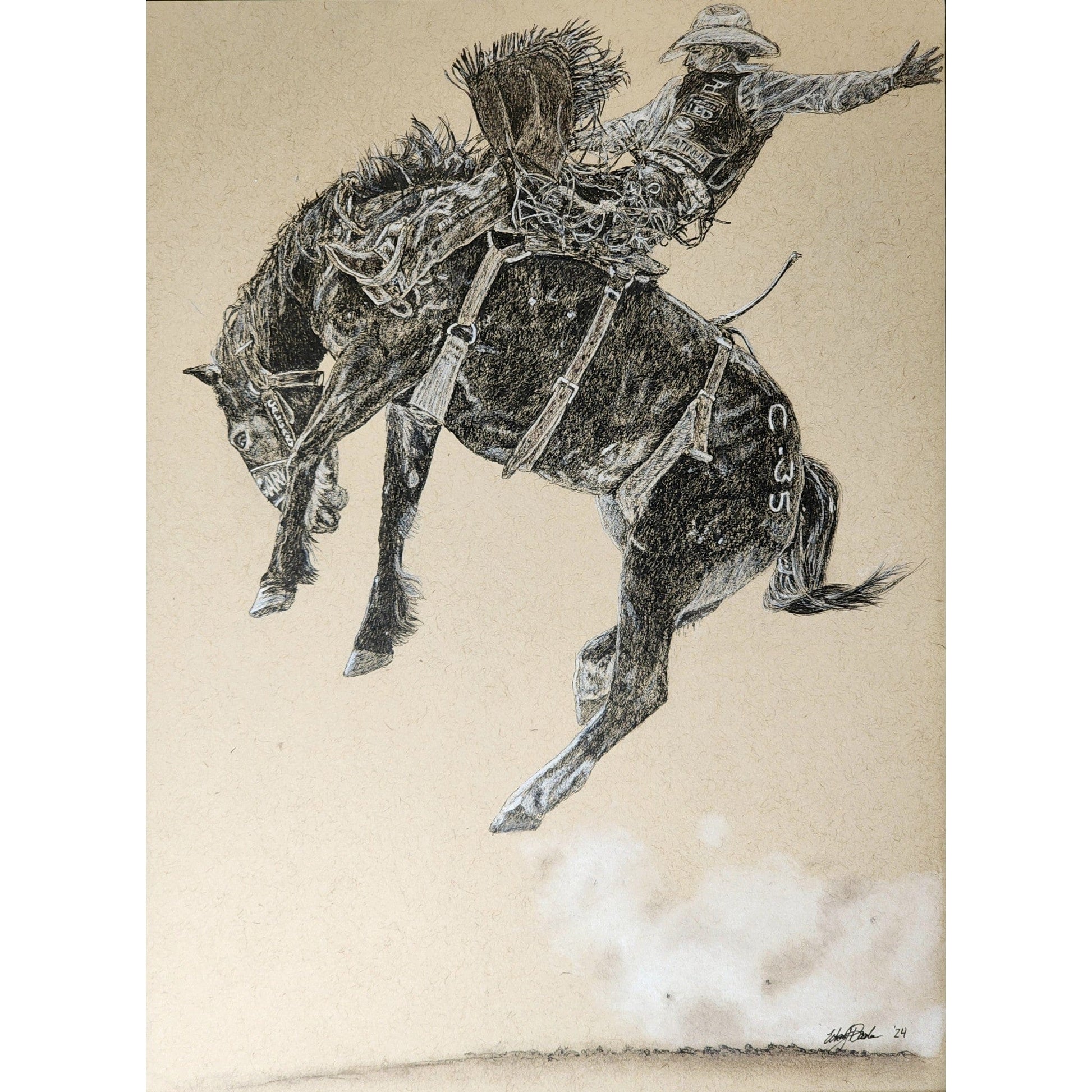 Pen and white charcoal pencil drawing of Isaac Diaz on a @cs_rodeo horse.
